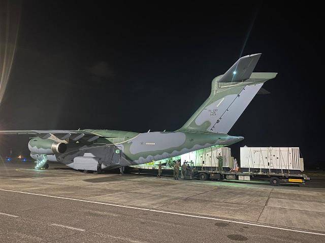 Este sábado, un KC-390 Millennium de la Fuerza Aérea, del Primer Grupo de Transporte de Tropas (1er GTT) - Escuadrón Zeus, transportó más de 14 toneladas de equipos. En Brasilia cargó 1.200 unidades de baterías del Tribunal Superior Electoral (TSE) que se utilizará en las urnas para las elecciones de 2020, por un total de 2,68 toneladas. El despegue del Ala 1 fue a las 5:55 y el aterrizaje en el Ala 8, en Manaus , a las 9:00 , cuando se cargaron dos generadores, con un total de 11,4 toneladas. La aeronave aterrizó en Macapá a las 00:40 am del domingo.