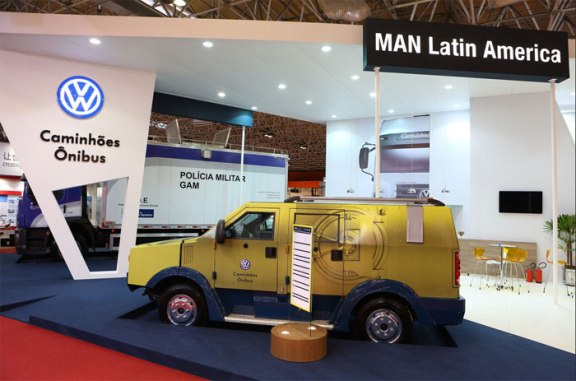 Man Latin América expone el chasis reforzado 5.150 ECE- desarrollado localmente junto a la firma especializada "Protege, " con la mayor flota VW de furgones blindados, más de 700 vehículos - para transporte de valores y uno de los 22 vehículos reformados por la brasileña Truckvan sobre un modelo VW Constellation 15.190, montando las Plataformas de Observación Elevada (POE).