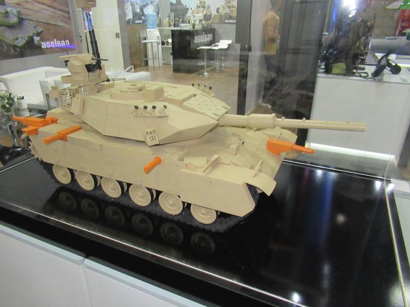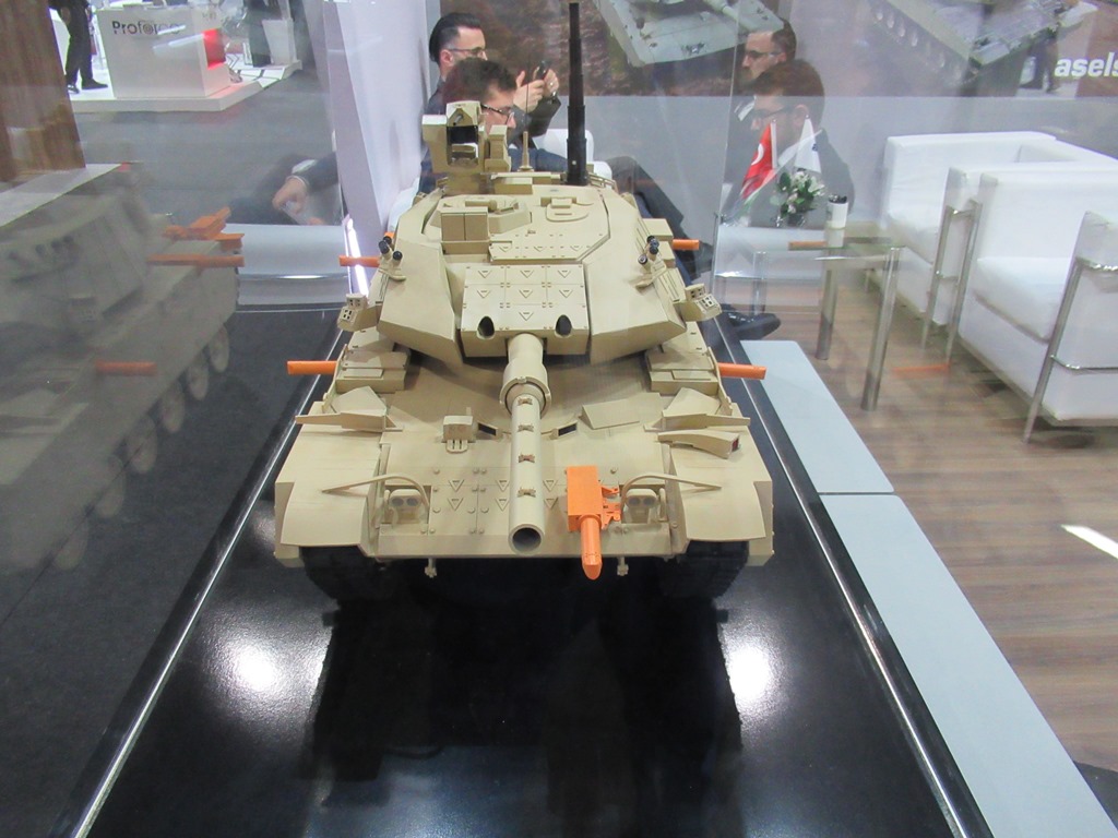 En estand de la compañía turca Aselsan, una de las abundantes compañías otomanas que han desembarcado en esta edición de la feria brasileña, se muestra una maqueta de un carro de combate M-60 profundamente modernizado equipado además con el sistema de protección activa Akkor PULAT de la compañía.