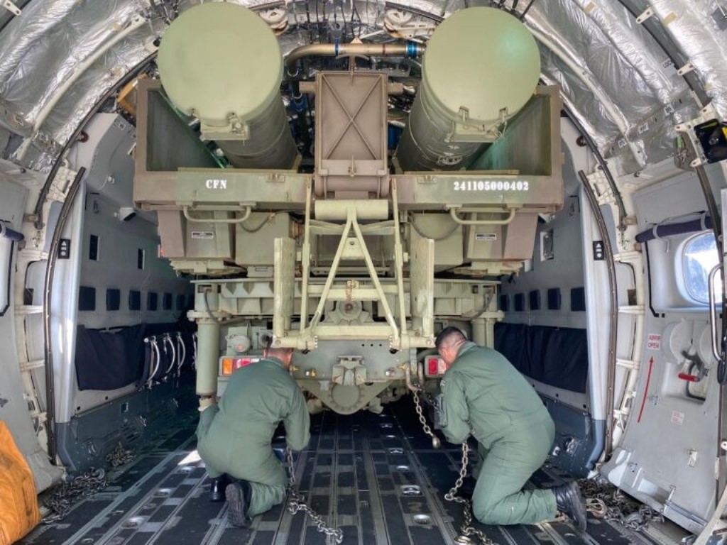 El camión ASTROS embarcado en el avión.