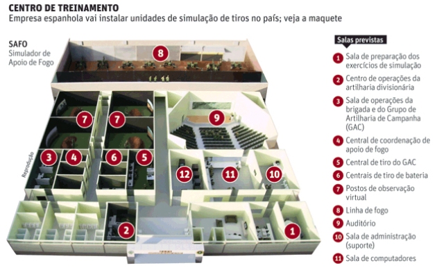 Según analizamos en marzo, del año pasado, en defensa.com, en las instalaciones construidas realizarán ejercicios los oficiales, cadetes y soldados de la Fuerza Terrestre. El SAFO actúa de la siguiente manera: ocho obuses, equipados con sensores de puntería, serán instalados en cada recinto de maniobras. En ellos se registrará toda la información referida a los disparos simulados. Al mismo tiempo, en otra sala, los observadores con binoculares especiales observan, en pantallas audiovisuales, la trayectoria de la bala después de dispararse. El siguiente paso, realizado por los observadores, es hacer correcciones con el fin de mejorar la precisión del disparo. Esta información se envía a una sala central, también dentro de la estructura del simulador, que transfiere los datos de nuevo a los obuses y así comienza otro ciclo. (José Mª Navarro García)