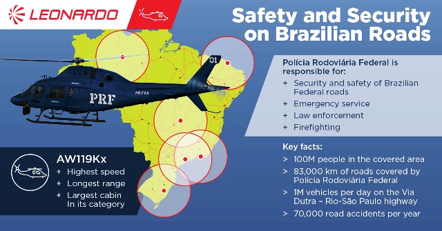 Hasta la fecha, hay más de 190 helicópteros Leonardo de varios tipos operando en Brasil que desempeñan diversas funciones, entre ellas: transporte corporativo/privado, seguridad pública, servicios públicos, transporte en alta mar y aplicaciones navales. A medida que el éxito del producto de Leonardo aumenta, la compañía se compromete a fortalecer aún más su nivel existente de servicios localizados, con el establecimiento de un nuevo centro de apoyo regional, dirigido por Leonardo do Brasil, en Itapevi, a 30 km de São Paulo, cuya inauguración se celebró en febrero.