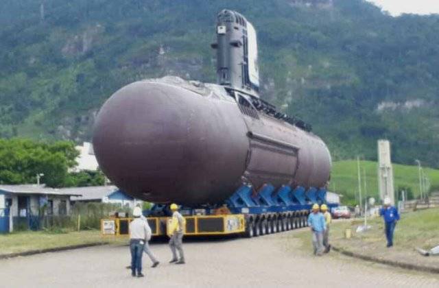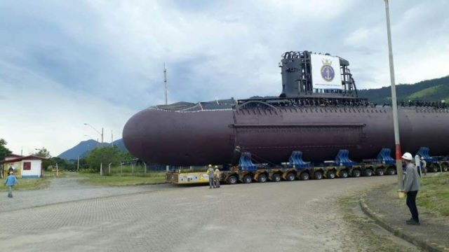El futuro submarino Riachuelo, S-BR1, primero de la clase Scorpene construido en el Complejo Naval de Itaguaí, fue trasladado este pasado sábado para la etapa final de su construcción, en la Base Naval. Para realizar el movimiento del submarino, manteniéndolo estable y equilibrado, se utilizó una compleja tabla de carreteras especializada equipada con decenas de ejes, distribuyendo el peso de forma segura en el piso de las vías de acceso.