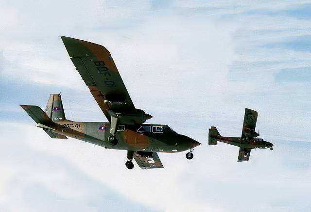 El Ala Aérea de la Fuerza de Defensa de Belice fue establecida en 1983, con su base en el Aeropuerto Internacional Philip S. W. Goldson en Ladyville. Sus primeras máquinas fueron dos Britten-Norman Defenders, que recibieron los registros BDF-01 y BDF-02. Su misión fue la de proveer reconocimiento, SAR, CASEVAC, reabastecimiento aéreo y transporte de tropas. Además, ayudan a la policía en la interdicción de drogas y las operaciones contra el contrabando. En 1988 el Ala Aérea obtendría 2 aviones Ayres Thrush. En octubre de 1998, el BDF-01 se estrelló cerca de Orange Walk, y un reemplazo llegaba en 2003, con el registro BDF-05. En 2007 este BDF-05 se estrelló en una zona pantanosa cerca de la costa de Belice, pero pudo ser recuperado.