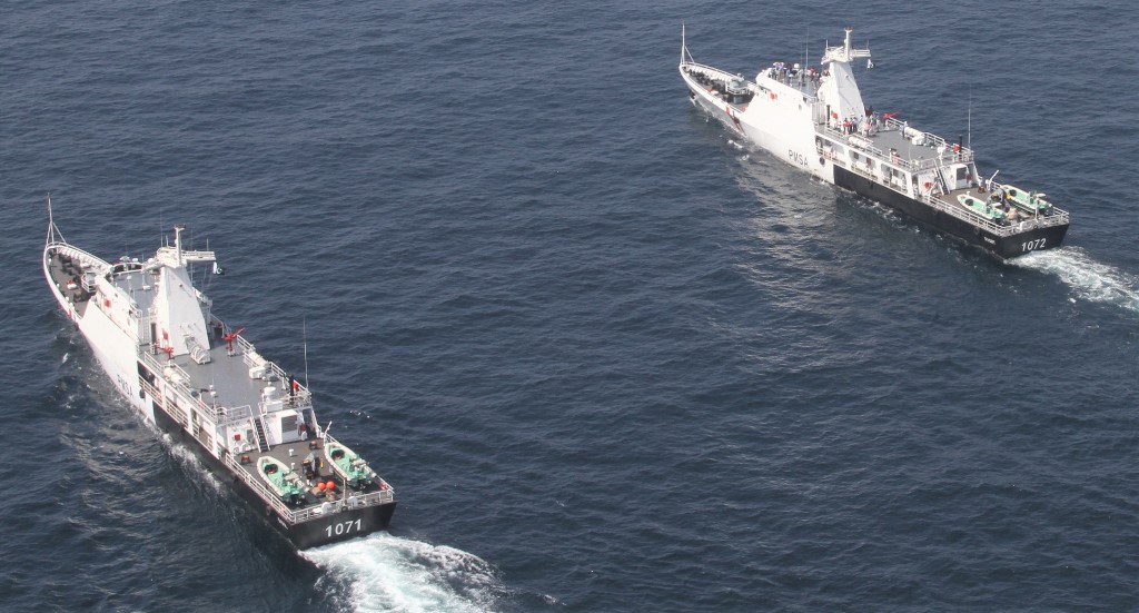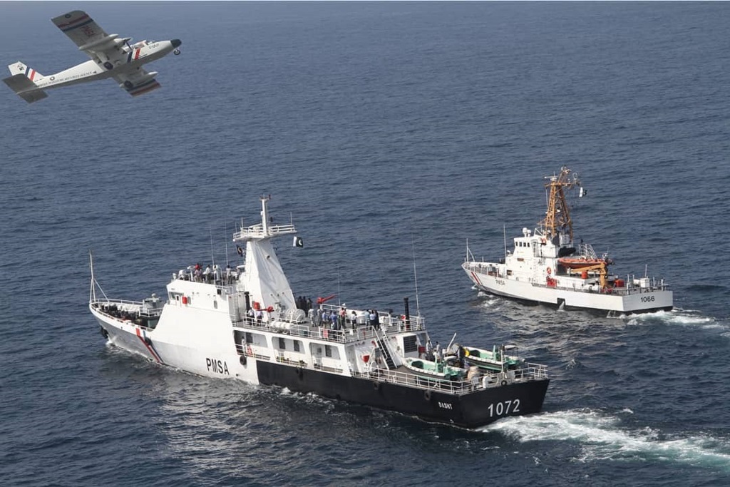 Aquí un patrullero oceánico (OPV) Hingol con un a patrullero de la clase Isla. El Hingol es un OPV construido por China para la Autoridad de Seguridad Marítima de Paquistán (PMSA), y el Isla es un ex patrullero de la USCG igual a tres suplidos a Costa Rica. (Foto – Pakistan Maritime Security Agency - PMSA).