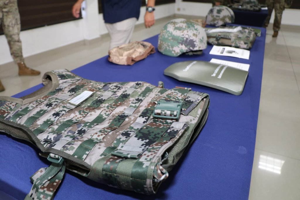 Chaleco antibalas táctico y placa balística nivel 4 y al fondo cascos tácticos todos con camuflaje digital. (Foto: Ministerio de Seguridad Pública)