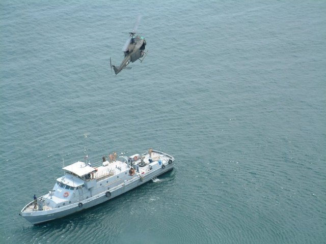 1. Patrullero Camcraft y UH-1H. La necesidad y facilidad de un plafon de aterrizaje es evidente.
