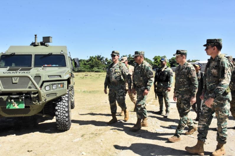 El Ministro de Defensa de República Dominicana y los comandantes del Ejército, de la Armada y de la Fuerza Aérea, junto a un Vamtac ST5 de la 4a Brigada de Infantería. (Ministerio de Defensa de R.D.)