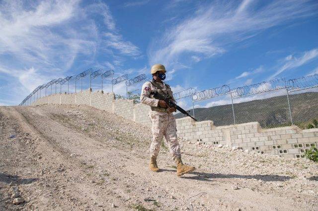 Soldado dominicano patrullando la verja perimetral de la frontera.