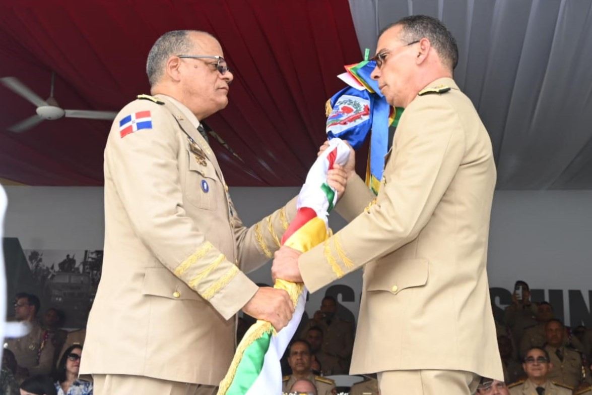 El mayor general (ERD) Jorge Iván Camino Pérez recibe del teniente general (ERD) Carlos A. Fernández Onofre, el estandarte de mando del Ejército de República Dominicana. (Foto: MIDE)