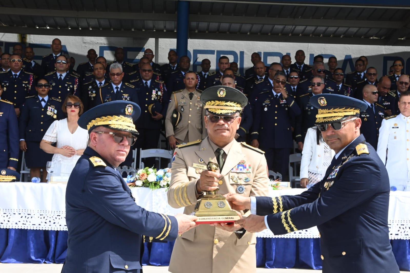 El mayor general piloto (FARD) Floreal Tarcicio Suárez Martínez, recibe el timón de mando como nuevo comandante general de la Fuerza Aérea de República Dominicana de manos del mayor general Técnico de Aviación (FARD) Carlos Febrillet Rodríguez, que ha sido designado como nuevo viceministro de Defensa para Asuntos Aéreos y Espaciales del Ministerio de Defensa. (Foto: MIDE)
