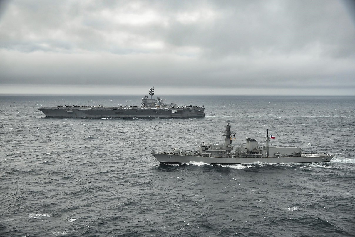 Fragata FF-07 Almirante Lynch de la Armada de Chile navegando en aguas chilenas junto al portaaviones USS George Washington.