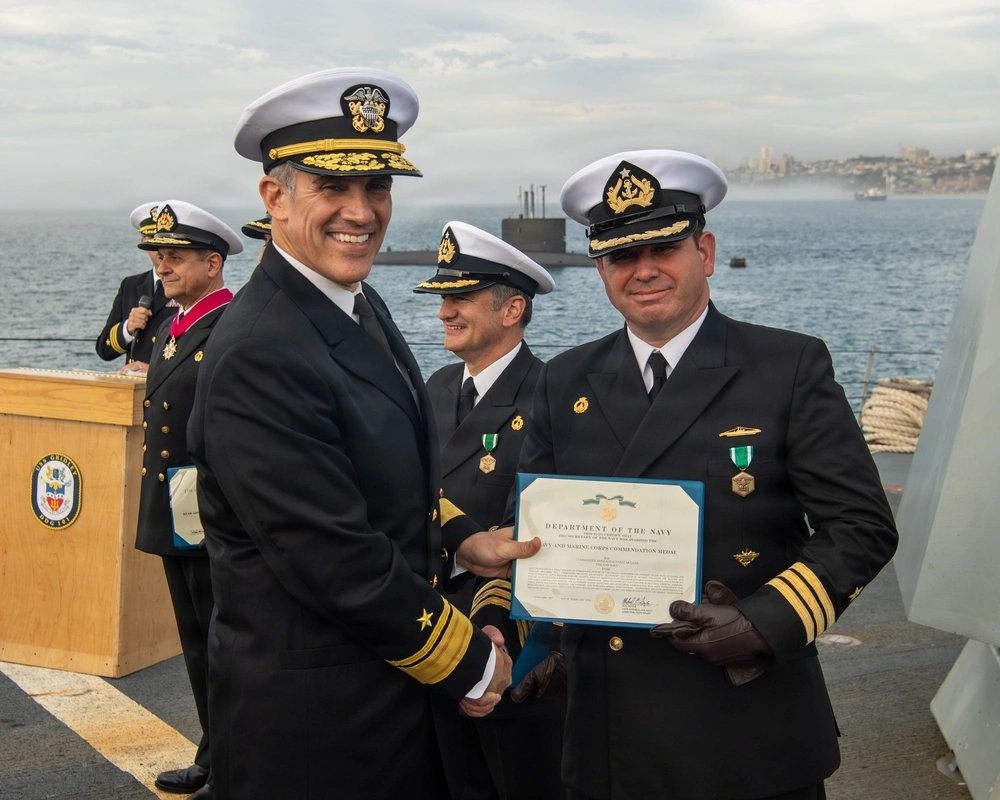 Días antes, el 17 de abril, durante la escala del grupo de combate en Valparaíso, el contralmirante Carlos Sardiello, comandante del Comando Sur de las Fuerzas Navales de EE.UU./Cuarta Flota, encabezó una ceremonia de condecoraciones a bordo del USS Gridley. En la proa del destructor, Sardiello entregó la Medalla de Encomio de la Armada y el Cuerpo de Marines (Navy and Marine Corps Commendation Medal) al comandante Gonzalo Álvarez Mc-Lean, entre otras distinciones a oficiales chilenos como el capitán de navío retirado Sergio Gómez Weber, el comandante Norman Patricio Ahumada García y el teniente Pablo Magna Zárate. También se otorgó la Legión al Mérito al contralmirante de la Infantería de Marina Flavio José Montagna Caneda.