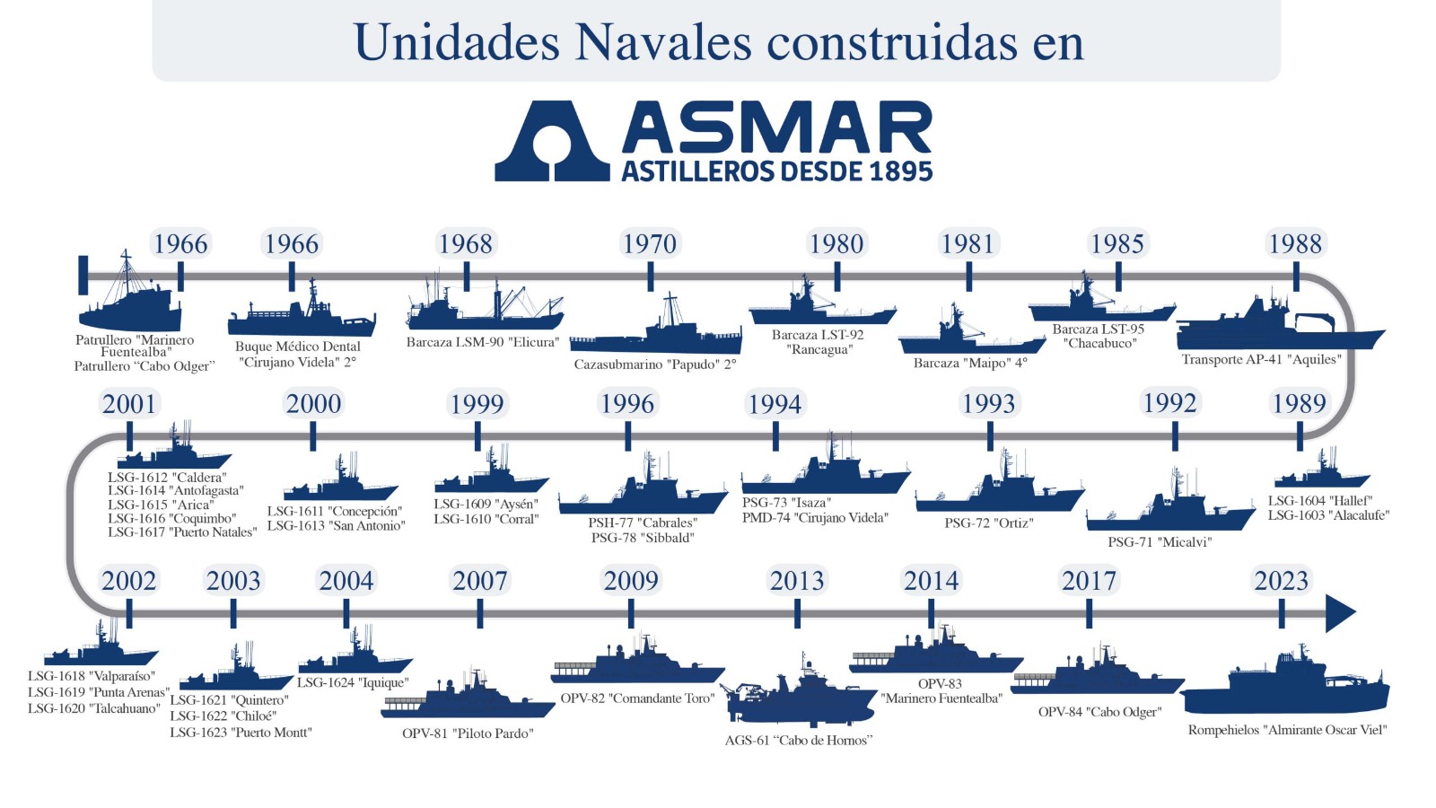 Desde sus inicios, ASMAR ha destacado por su versatilidad y capacidad técnica. Con plantas industriales en Talcahuano, Valparaíso y Magallanes, la empresa ha sabido adaptarse a las demandas cambiantes del sector naval. En Talcahuano, su principal centro productivo, se han llevado a cabo proyectos emblemáticos que han marcado la historia de la construcción naval en Chile y Sudamérica, como la reciente entrega del Rompehielos AGB-46 "Almirante Viel", un buque de última generación que refuerza la presencia chilena en la Antártica.