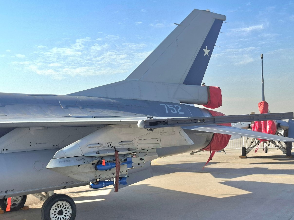 Bombas FAMAE BIAF-33 instalada en el pilón de un F-16 MLU (752) de la Fuerza Aérea de Chile en FIDAE 2026.
