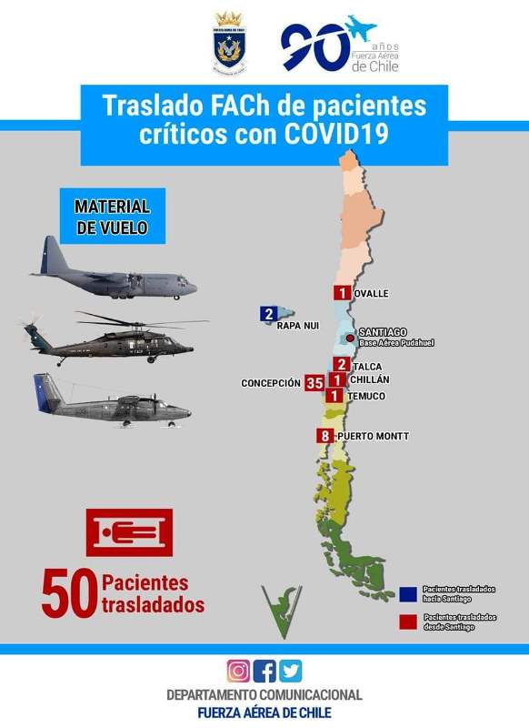 Desde el inicio de la emergencia, la Fuerza aérea de Chile puso a disposición de la autoridad sanitaria las capacidades polivalentes de sus medios aéreos, que cuentan con las condiciones técnicas y sanitarias de aislamiento y protección para la tripulación ya que el traslado está categorizado como "pacientes altamente infecciosos".