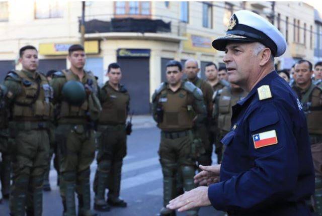 La Armada en tanto, desplegó sus capacidades para resguardar la seguridad y orden público en la región de Valparaíso principalmente, además de Talcahuano en la región del Biobio. De acuerdo al decreto N° 473 que establece estado de excepción constitucional de emergencia en la Región de Valparaíso, con excepción de la Provincia de Isla de Pascua y de la comuna de Juan Fernández, el Contraalmirante Juan Andrés De la Maza (en la foto), asumió la noche del sábado 19 de octubre de 2019, el mando como Jefe de la Defensa Nacional de la Región de Valparaíso, quedando bajo su dependencia las Fuerzas Armadas, de Orden y Seguridad pública que se encontraran presentes en la zona de la emergencia.