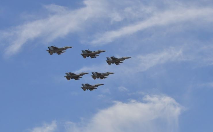 Acto seguido, se interpretó el himno de la Fuerza Aérea de Chile “Camaradas”, mientras aproximaba una bandada de aviones F-16, de la cual su líder se desprendió de la formación surcando hacia lo alto, como símbolo del alejamiento de las filas del Comandante en Jefe que deja el mando.