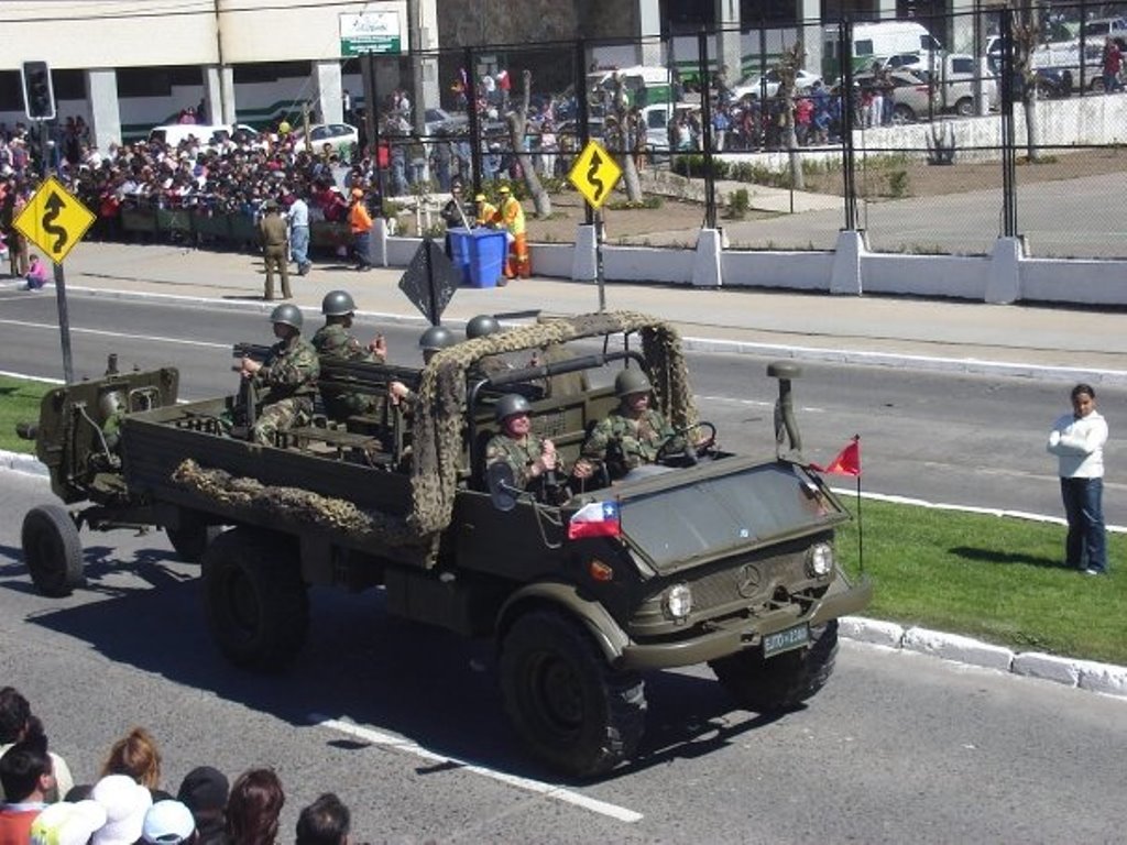 Camion MB Unimog 416 con una pieza M-56 oto melara de 105mm en un desfile en la VIII Región , Foto colección personal.