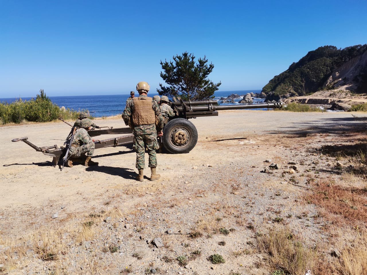 Instrucción de sirvientes pieza N.A M-101/33 del Grupo de Artillería "Silva Renard" en la zona costera de la VIII Región , Foto Ejército de Chile.