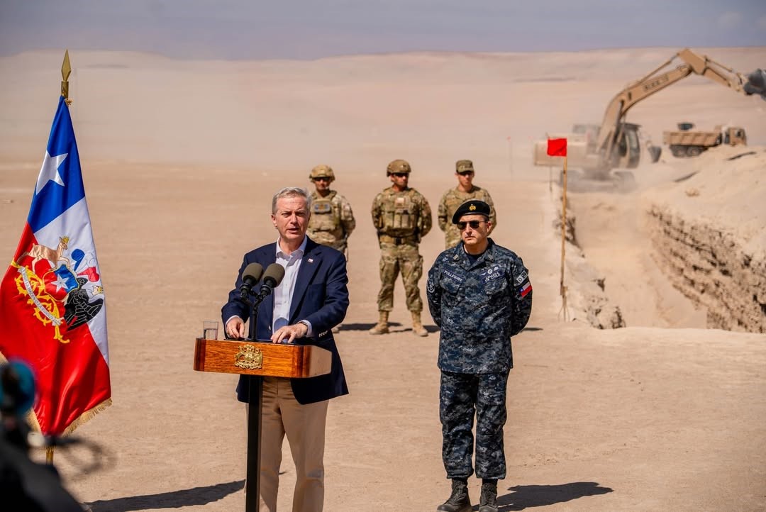 Presidente José Antonio Kast en Complejo Fronterizo de Chacalluta, mientras a sus espaldas una excavadora del Ejército de Chile realiza la zanja de tres metros.