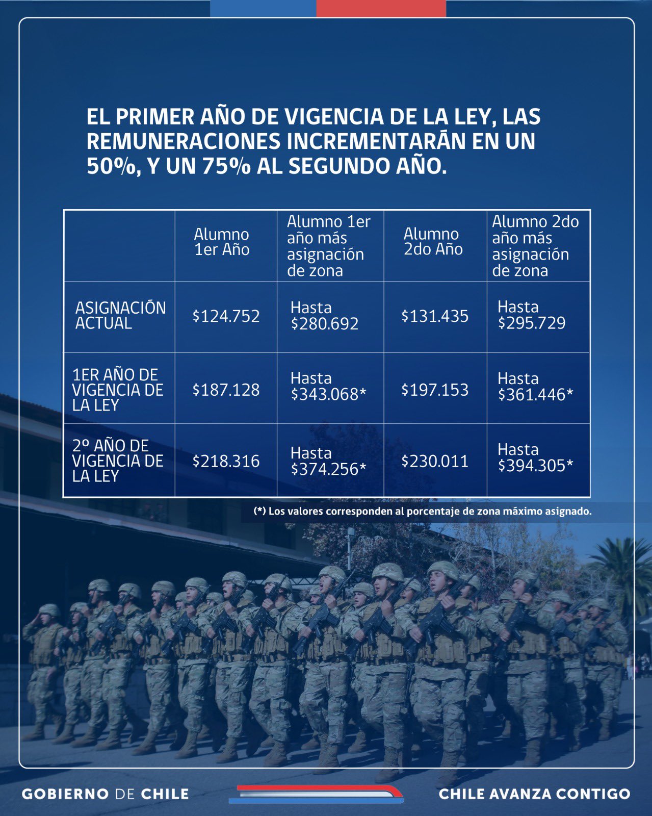 En 2025, los conscriptos de primer año pasarán de un sueldo mensual de 124 mil a 187 mil pesos, pudiendo alcanzar hasta 343 mil con asignaciones por zona. Los de segundo año, por su parte, incrementarán de 131 mil a 197 mil pesos, con un máximo de 361 mil. A partir de 2026, los montos subirán a 218 mil para el primer año (hasta 374 mil con asignaciones) y 230 mil para el segundo (hasta 394 mil con asignaciones).