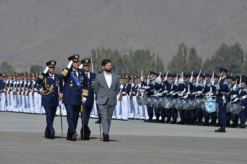 La ceremonia se inició con los honores de reglamento al Presidente de la República Gabriel Boric, quien revistó la Unidad de Formación, acompañado por el General del Aire Hugo Rodríguez González.