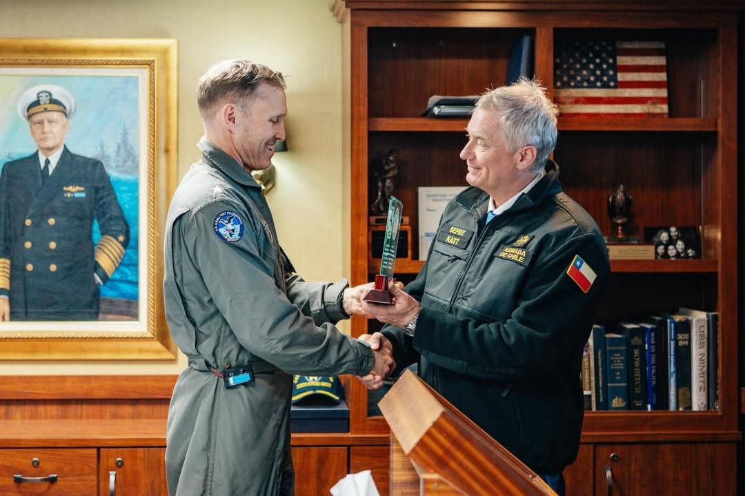 Contralmirante Cassidy Norman, comandante del Grupo de Ataque de Portaaviones 11, intercambia obsequios con el presidente de la República de Chile, José Antonio Kast Rist.