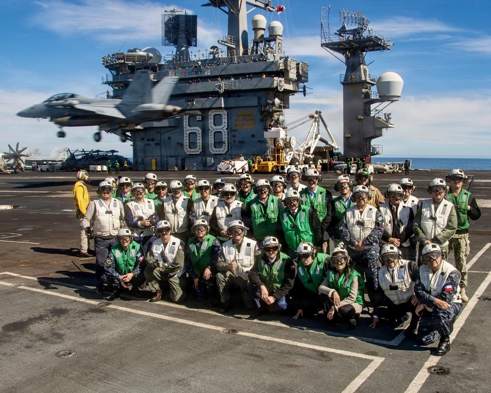 Presidente José Antonio Kast junto a si comitiva observando las operaciones de vuelo en la cubierta del portaaviones de clase Nimitz USS Nimitz (CVN-68)