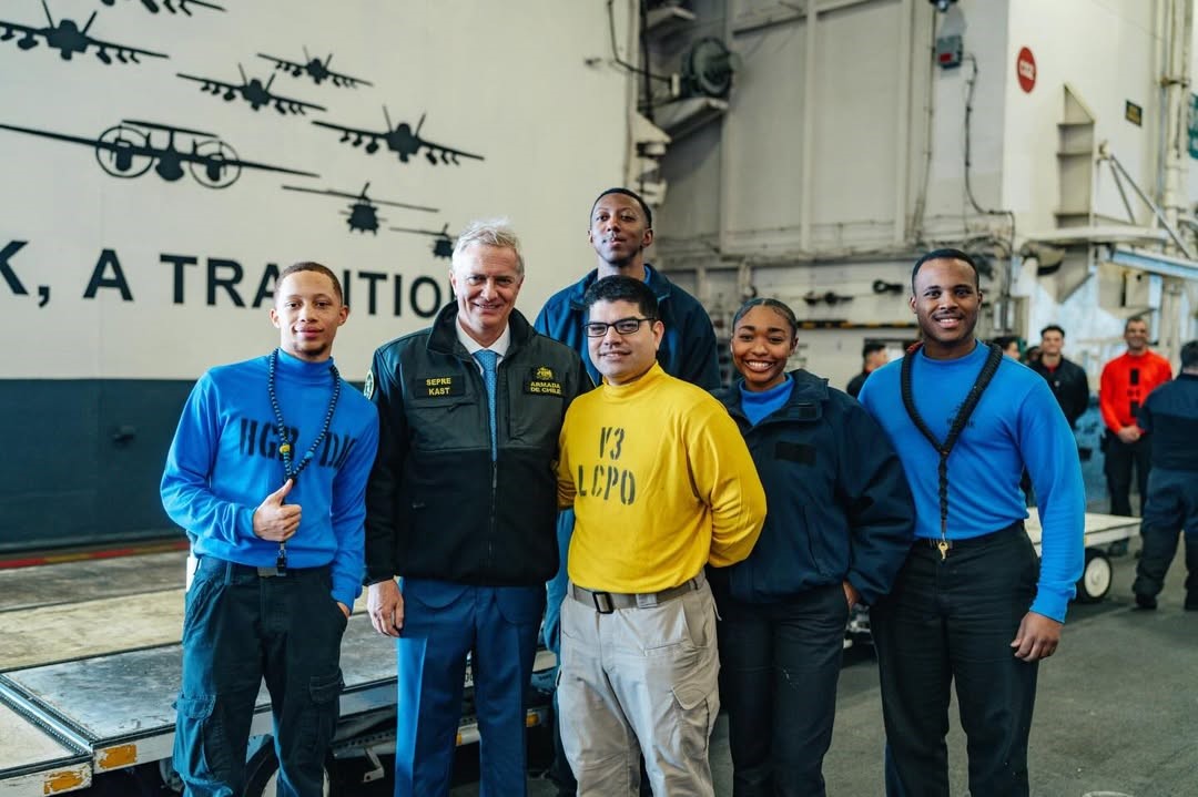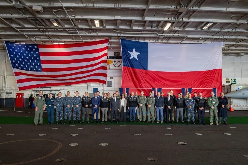 Presidente José Antonio Kast junto a la comitiva y miembros del US Navy, en el hangar del portaaviones de clase Nimitz USS Nimitz (CVN-68)