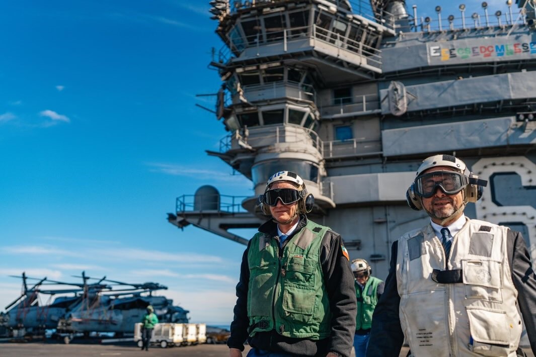 Presidente José Antonio Kast junto al canciller Francisco Pérez Mackenna, sobre la cubierta de vuelo del USS Nimitz (CVN-68) de la US Navy