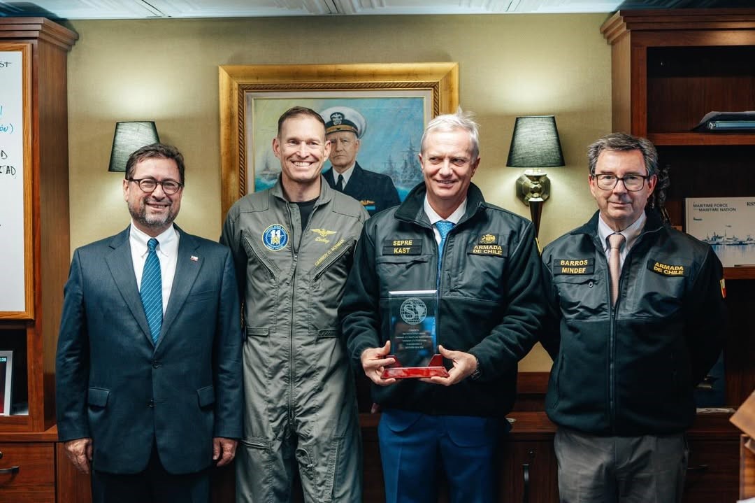 (Izquierda a derecha) canciller Francisco Pérez Mackenna, contralmirante Cassidy Norman, comandante del Grupo de Ataque de Portaaviones 11, presidente de la República de Chile, José Antonio Kast Rist y Ministro de Defensa Fernando Barros Tocornal