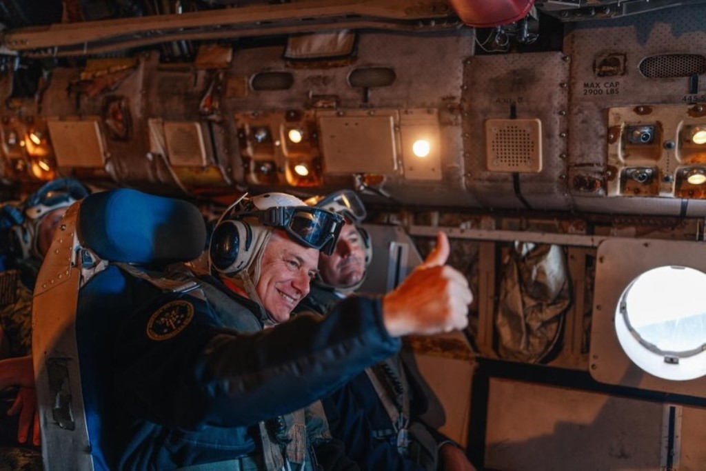 Presidente José Antonio Kast al interior del avión Grumman C-2A Greyhound con dirección al Portaaviones USS Nimitz (CVN-68)