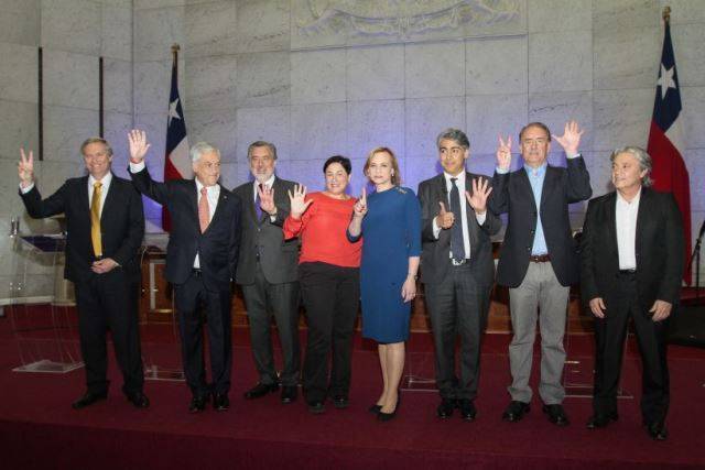 Fotografía: De Izquierda a derecha José Antonio Kast Rist, Sebastián Piñera Echenique, Alejandro Guillier Álvarez, Beatriz Sánchez Muñoz, Carolina Goic Boroevic, Marco Enríquez-Ominami Gumucio, Eduardo Artes Brichetti y Alejandro Navarro Brain.