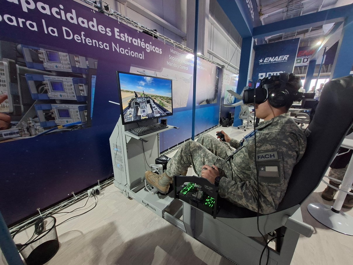 Entre los sistemas destacados figuró el Simulador T-40 Newen, que tuvo su primera exhibición pública en esta FIDAE. Se trata de una plataforma de entrenamiento para el avión de instrucción básica y avanzada T-40, desarrollada con tecnología nacional y pensada para reducir costos operativos sin sacrificar el nivel de preparación de los pilotos. DTS también presentó soluciones de realidad virtual y mixta, aplicables tanto en el ámbito militar como civil. En este segmento sobresalió el STT (Simulador Táctico de Tiro), junto a las plataformas Pilotlab y MR Studio, que permiten entrenamientos inmersivos y combinados de tripulaciones y controladores.
