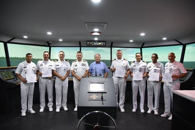 Luego de 32 horas de entrenamiento a bordo del simulador de puente full misión de 300 grados, el Contralmirante Juan Ricardo Rozo Obregón, director de la Escuela Naval de Cadetes, presidió la ceremonia de clausura del curso básico en operación de sistemas de propulsión azimutal.