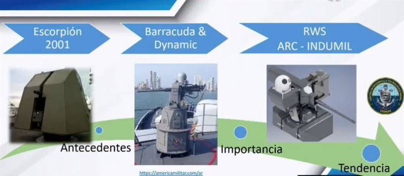 Basándose en sistemas autóctonos como el Escorpión, presente en 10 patrulleras de río desarrollado en 2001, y en el sistema Barracuda, instalado en 6 unidades navales, 3 patrulleras oceánica OPV 80 y 3 patrulleras de costa CPV46, desarrollado en 2012, la Armada de Colombia, adelanta junto a la Industria Militar Colombiana INDUMIL, el prototipo de una Estación de Armas Remota (RWS por sus siglas en ingles) para ser producida en serie.