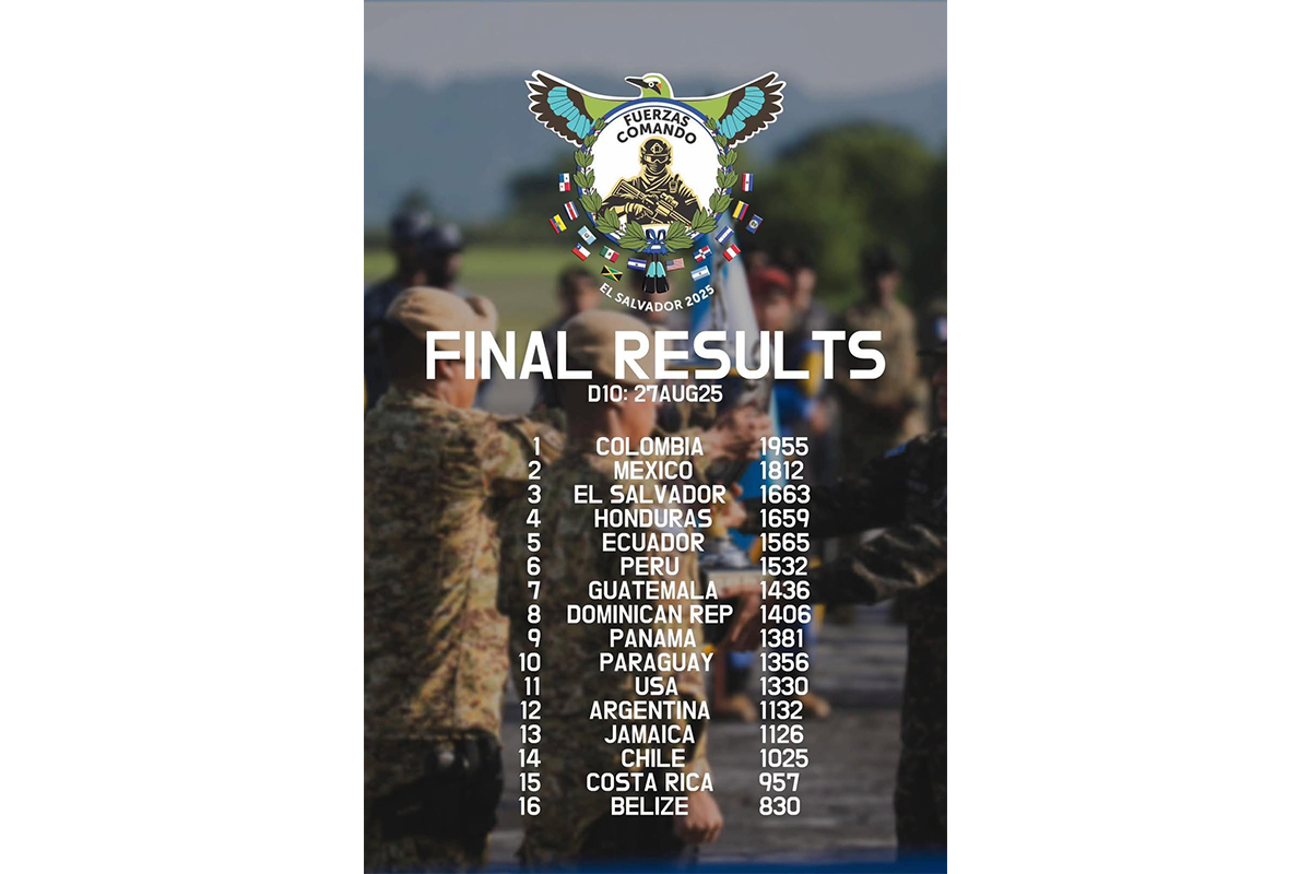 Realizada entre el 18 y el 29 de agosto en la Base Aérea de Ilopango, en El Salvador. Esta edición número 19 de Fuerzas Comando 2025, reunió a 16 países del continente americano en una serie de exigentes pruebas que pusieron a prueba la preparación física, táctica y técnica de las unidades de operaciones especiales. La delegación colombiana, compuesta por ocho integrantes de las Fuerzas Militares (Ejército, Armada y Fuerza Aeroespacial), logró proclamarse campeona con un desempeño sobresaliente al obtener un puntaje total de 1.955 puntos, superando a México (1.812) y a El Salvador (1.663), quienes ocuparon el segundo y tercer lugar, respectivamente.