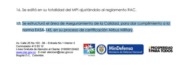 Informe de gestión de la CIAC donde se evidencia que se encontraba en proceso para recibir la certificación ante el fabricante Airbus Military.