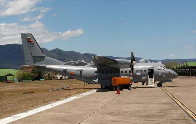 CN-235 de matricula 1261 de la FAC, donde se pueden apreciar todos los sistemas de guerra electrónica con los que contaba.