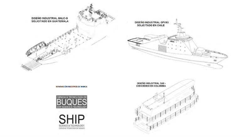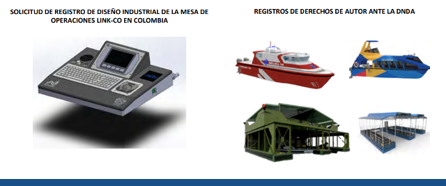 • Protección ante la Dirección Nacional de Derechos de Autor de Colombia de los productos: “LANCHA SACUDETE”, “LANCHA AMBULANCIA”, “MUELLE FLOTANTE TIPO E” y “PLATAFORMA AVANZADA DE GUARDACOSTAS - PAG” como obras digitales.