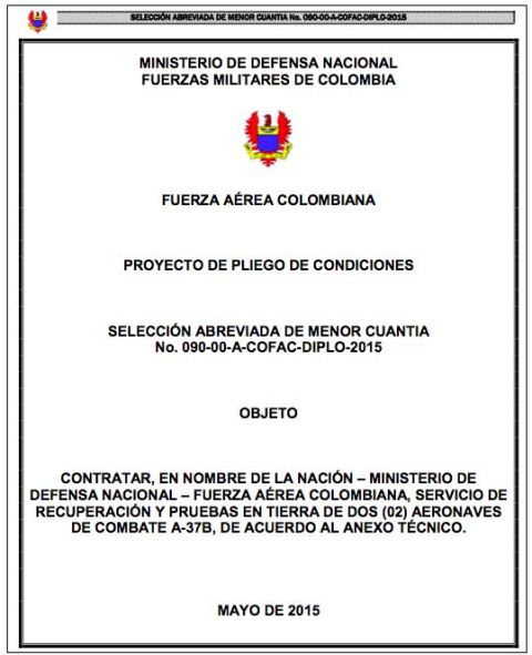 El contrato fue suscrito por el teniente coronel Juan Manuel Ávila Palomino, en representación del Ministerio de Defensa nacional, y la Fuerza Aérea Colombiana, quien actúa como director de procesos logísticos de esta fuerza. Tiene un valor de 4.097.999,976 pesos colombianos, aproximadamente 1,4 millones de dólares, y fue adjudicado a la empresa Integrated Engineering Services S.A.S. Al proceso también presentaron propuestas la Corporación de la Industria Aeronáutica Colombiana CIAC S.A., la Unión Temporal A1t-i Aviones A-37 2015 y Horizontal de Aviación S.A.S.
