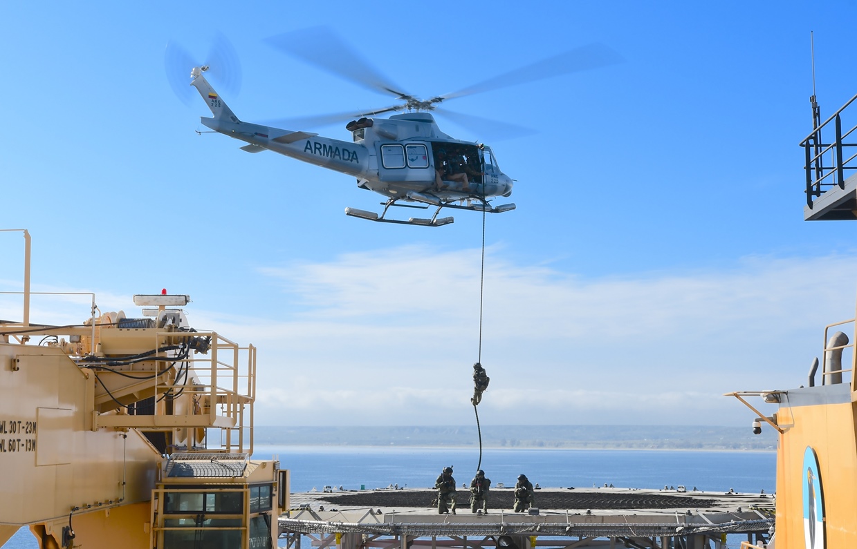 El primero de los ejercicios se realizó el pasado 6 de septiembre sobre la cubierta de vuelo del ARC Victoria de la Armada de Colombia, el día 7 del mismo mes se tenía programado el descenso de los infantes de marina mexicanos sobre la cubierta del rompehielos ingles de la Royal Navy HMS Protector de 6.400 toneladas de desplazamiento y 89,7 mt de eslora; pero debido a vientos de más de 45 nudos y a un mar nivel 5, se tuvieron que reprogramar para el día 8.