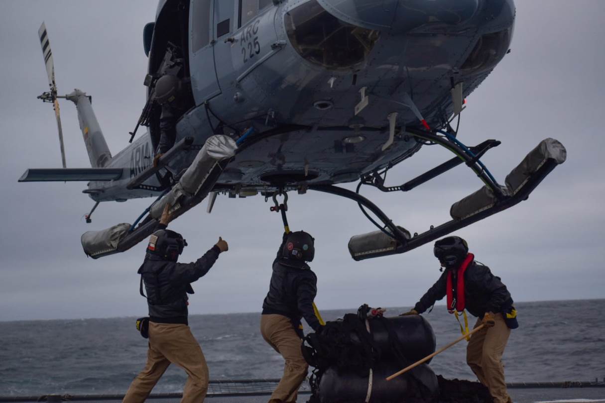Por otro lado, el ejercicio de transporte de carga externa en el helicóptero Bell 412, el teniente Rojas “HORUS”, despegó con vientos favorables, saliendo por estribor y sobrevolando al ARC Victoria, tomando posteriormente posición para acercarse al helipuerto del patrullero, ubicándose a 15 pies de este, siendo la carga enganchada por rescatistas de personal de la Aviación Naval.