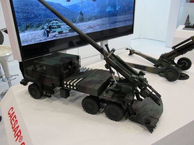 Destacaba la maqueta del CAESAR en versión 6X6, el cañón autopropulsado de 155 mm. y 52 calibres en servicio en el ejército francés, que lo ha desplegado en misiones de combate en el extranjero con notable éxito, por ejemplo en la Task Force Wagram, donde realizó más de 2500 misiones de fuego contra el Daesh. Es capaz de disparar seis proyectiles en menos de un minuto, se trata de una plataforma de elevada movilidad, lo que le permite evitar el fuego de contrabatería.