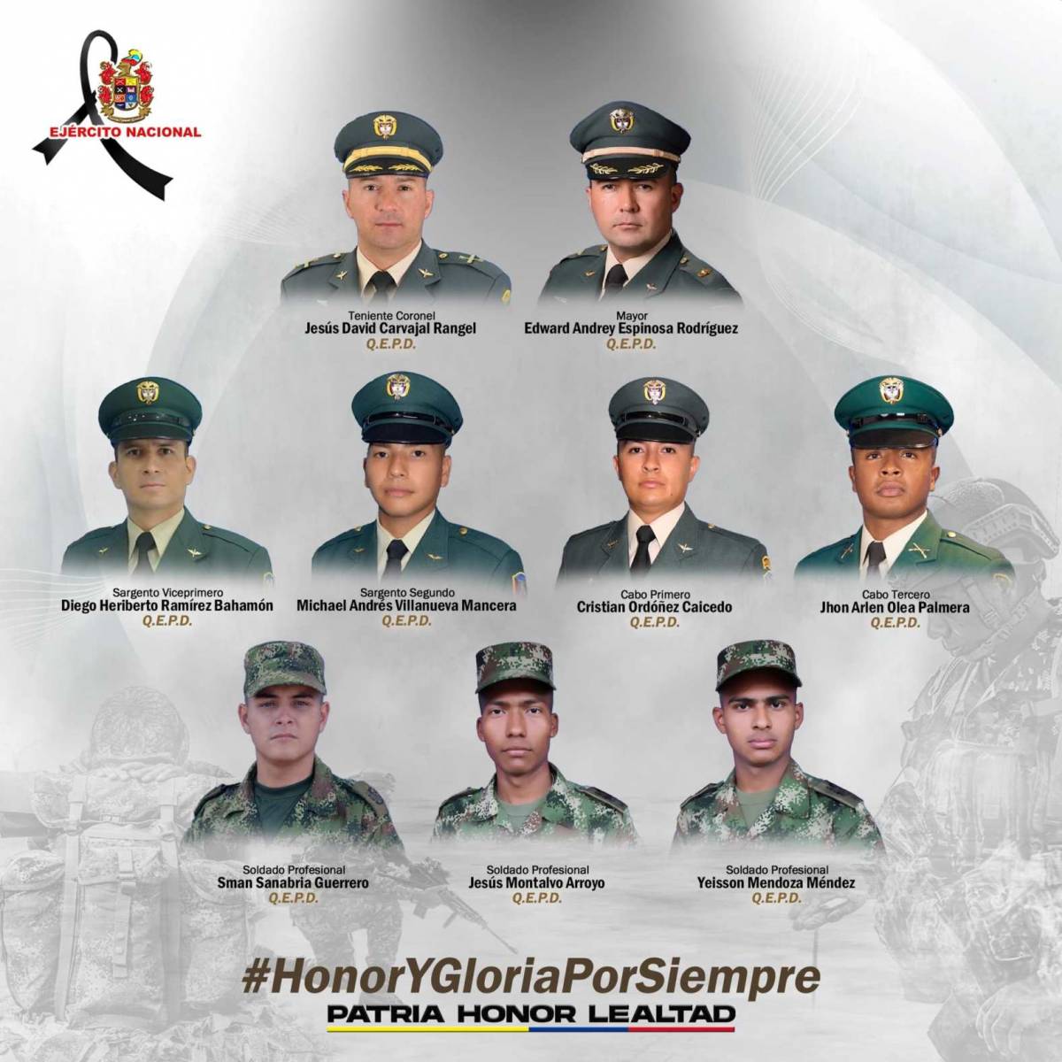Ya pasada la tarde, lamentablemente, se confirmó el fallecimiento de nueve uniformados que viajaban a bordo de la aeronave. Los militares que perdieron la vida son: Teniente Coronel Carvajal Rangel Jesús David, Mayor Espinosa Rodríguez Edward Andrey, Sargento Viceprimero Ramírez Bahamón Diego, Sargento Segundo Villanueva Mancera Michael, Cabo Primero Ordoñez Caicedo Cristian, Cabo Tercero Olea Palmera Jhon Arlen, Soldado Profesional Sanabria Guerrero Osman, Soldado Profesional Montalvo Arroyo Jesús, y Soldado Profesional Mendoza Méndez Yeisson.