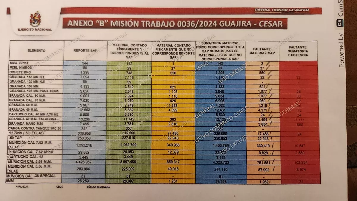 Pero en el caso de la Décima Brigada en la Guajira, y analizando el cuadro "Anexo B Misión Trabajo 0036/2024 Guajira-Cesar", el verdadero material faltante es de tan solo: