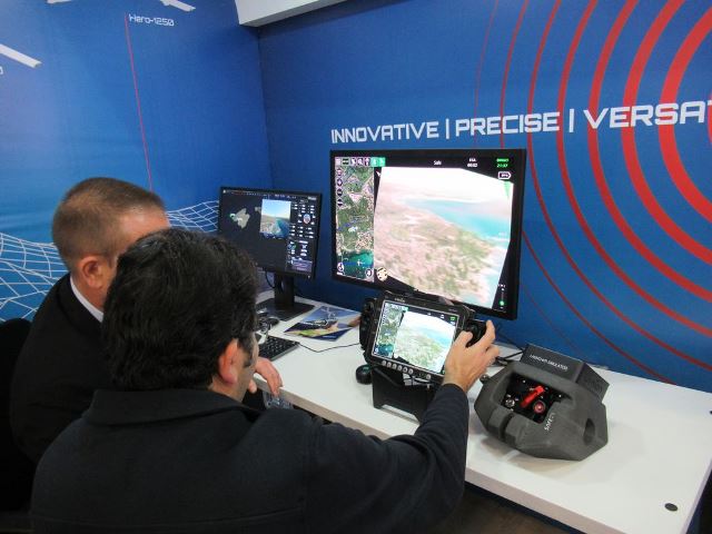 El simulador que la compañía tenía en su stand permitía conocer en primera persona el modo en que este sistema funciona, similar en las diferentes versiones de la familia Hero que comercializa UVision. El simulador se compone de una tablet rugerizada que incluye los mandos para dirigir el UAV y su sistema electroóptico, así como un dispositivo que simula el lanzamiento neumático del Hero. Una vez este está en vuelo, la pantalla presenta la información visual captada por este y se permite elegir el área sobre la que vigilar, acción que puede realizar automáticamente a la espera de instrucciones.