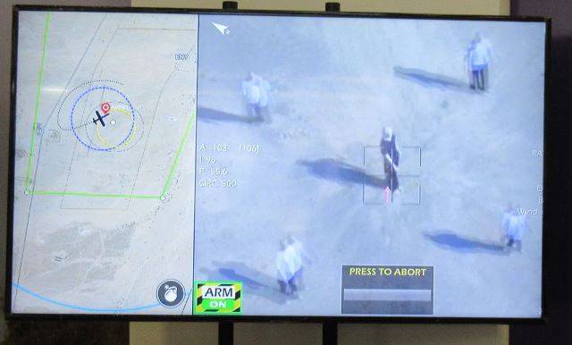 Una vez elegida el área de interés, el UAV se dirige hacia la zona, permitiendo emplear el zoom para seleccionar de forma precisa el punto de impacto, en este caso un vehículo 4x4. Se puede elegir el tipo de objetivo según se trate de un vehículo, un objetivo personal o individual o la ventana de un edificio, lo que permite imaginar la precisión del sistema. Una vez seleccionado el blanco, el UAV, actuando ahora como un proyectil guiado, se dirige hacia este, permitiendo en todo momento abortar el ataque y mostrando en pantalla todo el trayecto hasta el impacto final.