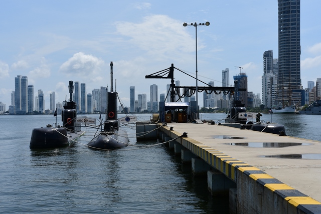 Muelle de submarinos en la base ARC Bolívar, se aprecian los submarinos ARC “Indomable” y ARC “Intrépido” de la clase U-206A y el ARC “Pijao” de la clase U-209.